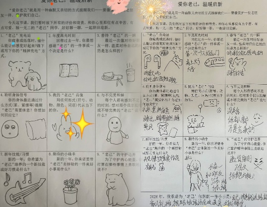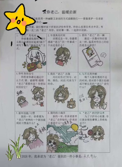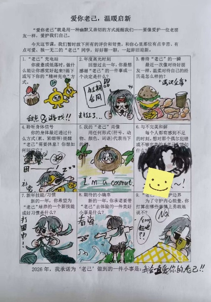 活动以“像爱护老朋友一样爱护自己”为核心,设计了九大趣味互动环节,让同学们放下对自己的苛责,与内心的“老己”展开一场温暖对话。在“老己”充电站,大家认真写下听歌、绘画、散步等专属精神充电方式;年度高光时刻分享中,同学们细数过往成就,真诚感谢努力的自己;绘制“老己”肖像环节,大家用色彩、符号、动物等创意形式,描绘独一无二的自己。从聆听身体的休息信号,到与不完美的自己和解,从规划新年新习惯,到许下专属小确幸,每一个环节都让同学们在书写与表达中,重新认识自己、接纳自己。