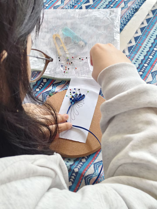 课堂分为文化导学和技法实操两个环节。文化导学环节,指导老师通过图片和视频资料,梳理了盘扣从明清时期到现代设计的演变过程,介绍了盘扣作为中式服饰关键部件的结构特点与文化含义。实操环节中,学生在老师指导下依次完成盘、绕、穿、结等基本技法,最终独立完成一枚传统盘扣的制作。