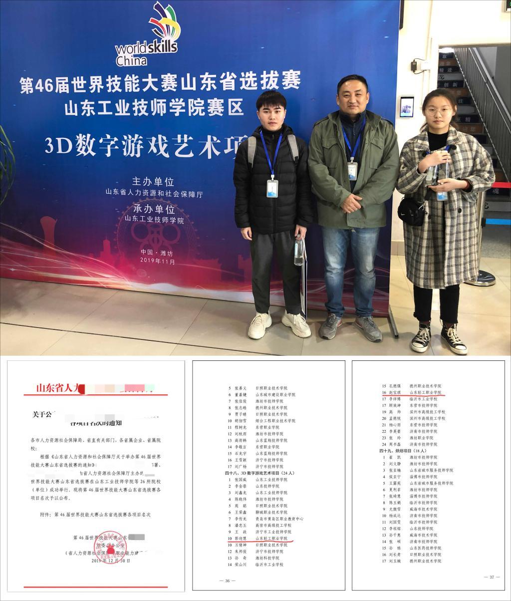 2019年12月30日,在山东省人力资源和社会保障厅刚刚公布的第46届世界技能大赛山东省选拔赛结果中,我校艺术设计系动漫制作技术专业2017级学生郭迎慧和赵宝琪分别获得了3D数字游戏艺术项目的第10名、第16名的好成绩,并成为国赛的山东省集训队选手备选。